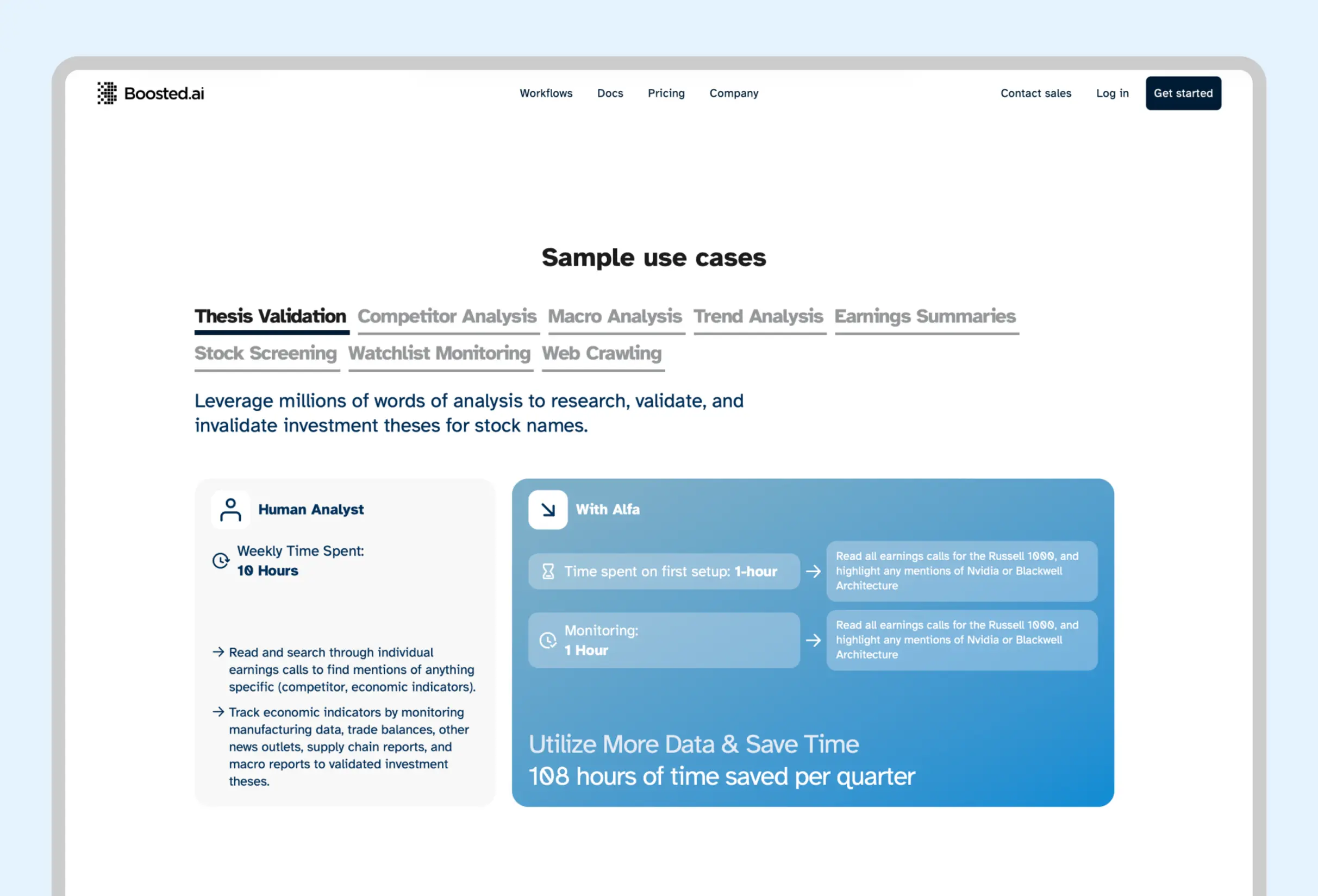 At the heart of Boosted’s AI platform is Alfa, the company’s flagship product. Alfa uses intelligent “workflows” to guide analysts through complex financial reasoning—helping them research, analyze, and produce comprehensive reports using AI and large language models.